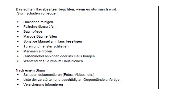 Lose Dachziegel, herumliegende Gegenstände im Garten oder morsche Äste können bei einem Sturm Passanten verletzen oder parkende Autos beschädigen. Hausbesitzer haben auf ihrem Grundstück die Verkehrssicherungspflicht: Sie können bei einem Schadenfall haftbar gemacht werden, wenn sie Gefahrenquelen auf ihrem Grundstück nicht beseitigen. „Damit nichts und vor allem niemand zu Schaden kommt, müssen Hausbesitzer schon von vornherein regelmäßig mögliche Risiken kontrollieren und beheben“, warnt Marotz. Wenn trotzdem etwas passiert, kommt in der Regel die Grundstückshaftpflichtversicherung für den Schaden auf.