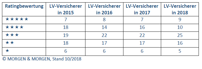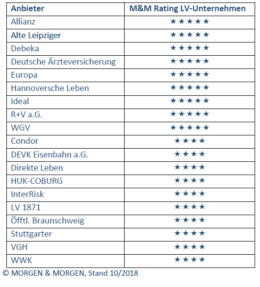 Das M&M Rating LV-Unternehmen bewertet, wie sich eine Gesellschaft langfristig am Markt behauptet. Es werden Aussagen über Kosten, Sicherheitspolster, Erträge sowie die Marktstellung getroffen. Im diesjährigen Rating erreichen neun der 65 Versicherer eine ausgezeichnete Bewertung mit fünf Sternen und zehn Gesellschaften eine sehr gute Bewertung mit vier Sternen.