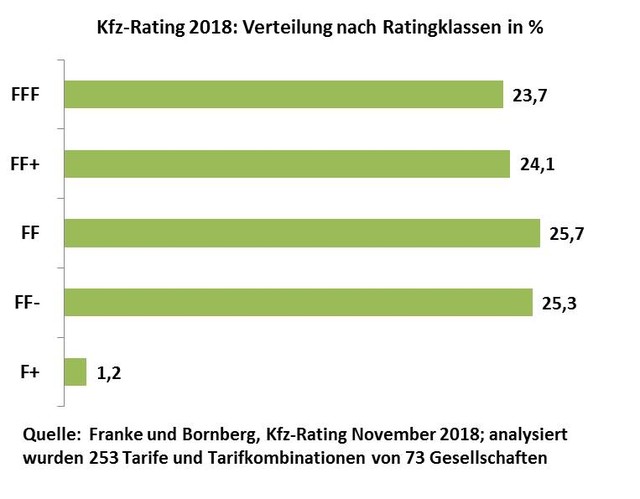 253 Tarife und Tarifkombinationen von 73 Gesellschaften wurden nach 61 Kriterien analysiert – macht unter dem Strich exakt 15.433 Positionen, die in das Kfz-Rating 2018 einfließen. Sie werden entsprechend ihrer Bedeutung gewichtet. Maßgeblich für das Ergebnis sind jene Kriterien, die für die Mehrzahl der Kunden wichtig sind. Spezielle Risiken wie zum Beispiel die Fahrerunfallversicherung fließen nicht in die Bewertung ein. Die Ratingergebnisse ordnet Franke und Bornberg in Bewertungsklassen ein, für die jeweils Mindeststandards definiert sind.