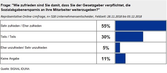 Die SIGNAL IDUNA bietet Arbeitgebern weiterhin ganz konkrete Hilfe bei der Neugestaltung von Entgeltumwandlungsvereinbarungen im Rahmen der Zuschusspflicht an. Wichtig ist dem Versicherer, dass die Arbeitgeber über ihre Pflichten informiert sind. Nur gut informierte Firmenchefs können ihre Gesetzespflicht erfüllen und darüber hinaus die Chancen der betrieblichen Altersversorgung als wirkungsvolles Personalbindungsinstrument nutzen.