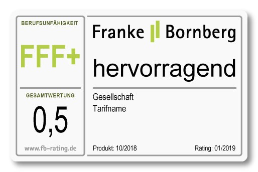 Als Folge des starken Wettbewerbsdrucks im Markt sind Spitzenleistungen bei BU-Produkten mittlerweile an der Tagesordnung. Um das Feld der besonders leistungsstarke Tarife differenzierter zu betrachten, hat Franke und Bornberg mit FFF+ eine zusätzliche Ratingklasse für Spitzenprodukte geschaffen. Somit stehen jetzt insgesamt sieben Klassen zur Bewertung der Tarifqualität zur Verfügung. Das bisherige Höchstrating FFF steht weiterhin für ausgezeichnete Qualität.