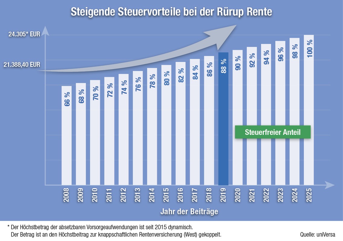 Die staatlich geförderte Rürup-Rente gewinnt weiter an Attraktivität. Seit 1. Januar 2019 können 88 Prozent der Beiträge als Sonderausgaben steuerlich geltend gemacht werden.