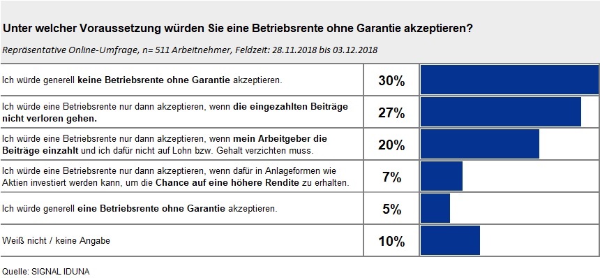 Doch auch bei Arbeitgebern ist noch viel Aufklärungsarbeit in punkto Sicherheit zu leisten. In der gleichen Online-Umfrage sagten die Arbeitgeber, die eine Einführung des Sozialpartnermodells in ihrem Betrieb für weniger sinnvoll erachten, dass sie ihren Mitarbeitern keine Betriebsrente ohne Garantien empfehlen würden (52 Prozent).