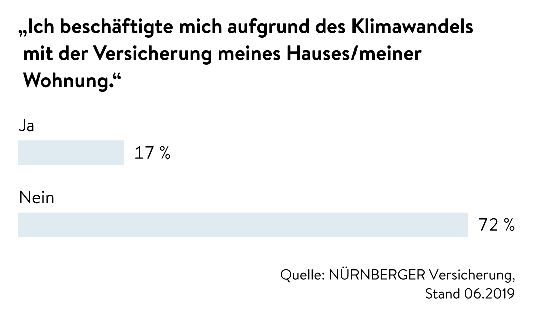 Für immerhin 17 Prozent der Befragten ist der Klimawandel ausschlaggebend, sich mit der Versicherung ihrer Wohnung oder ihres Hauses zu beschäftigen. Insbesondere Hausbesitzern ist das Thema wichtig: 30 Prozent geben an, deshalb über die Absicherung ihrer Immobilie nachgedacht zu haben. „Schäden durch Naturgefahren wie Starkregen, Überschwemmungen oder Erdrutsch sind nicht automatisch in der Hausrat- oder Wohngebäudeversicherung eingeschlossen. Sie werden nur über den Zusatzbaustein „Erweiterte Naturgefahren“ gedeckt“, so Peter Meier. Und die Bevölkerung sollte sich im Ernstfall nicht auf den Staat verlassen. Denn die bayerische Staatsregierung schafft zum 1. Juli 2019 die finanziellen Soforthilfen bei Elementarschäden komplett ab. Auch andere Bundesländer denken bereits über ähnliche Schritte nach. Seit 2017 ist die Nürnberger deshalb Partner der Kampagne „Elementar versichern“ und informiert die Öffentlichkeit über den notwendigen Versicherungsschutz.