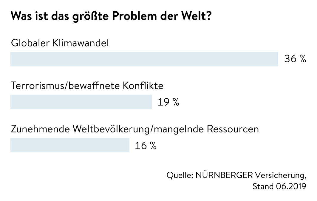 Die Angst vor dem Klimawandel treibt die Deutschen um: 36 Prozent der Befragten geben an, dass sie den Klimawandel weltweit als größtes Problem sehen. Und verweisen damit Gefahren wie Terrorismus/bewaffnete Konflikte (19 Prozent) und den Anstieg der Weltbevölkerung/mangelnde Ressourcen (16 Prozent) auf die hinteren Plätze. Mehr als drei Viertel (76 Prozent) haben das Gefühl, die Extremwettersituation habe in den letzten Jahren in Deutschland zugenommen. „Erschreckend ist: 8 Prozent glauben, dass es gar keinen Klimawandel gibt“, betont Peter Meier, Vorstandsmitglied bei der Nürnberger Versicherung. „Auf den ersten Blick ist das zwar keine große Zahl. Aber sie zeigt leider, dass es immer noch Menschen gibt, die das Thema nicht ernst nehmen.“