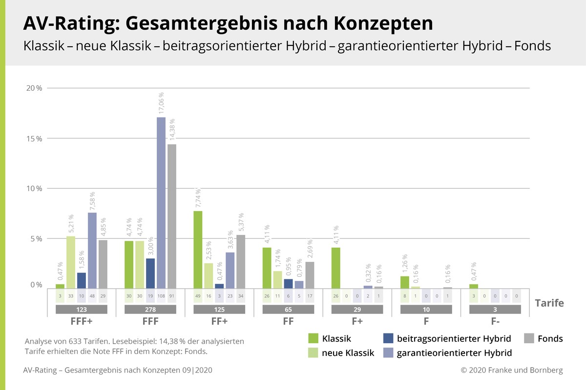 Der Vergleich zeigt: Überproportional viele leistungsstarke Produkte (Ratingstufen FFF+ und FFF) finden sich unter den Konzepten „Beitragsorientierter Hybrid“, „Garantieorientierter Hybrid“ sowie „Fonds“. Michael Franke führt den Qualitätsschub darauf zurück, dass diese Konzepte und damit die Gestaltung der Vertragsbedingungen vergleichsweise neu sind. „Je jünger eine Tarifgeneration, umso größer ist die Wahrscheinlichkeit, dass die Versicherer sich um eine qualitativ wettbewerbsfähige Produktgestaltung bemühen“, so Franke.