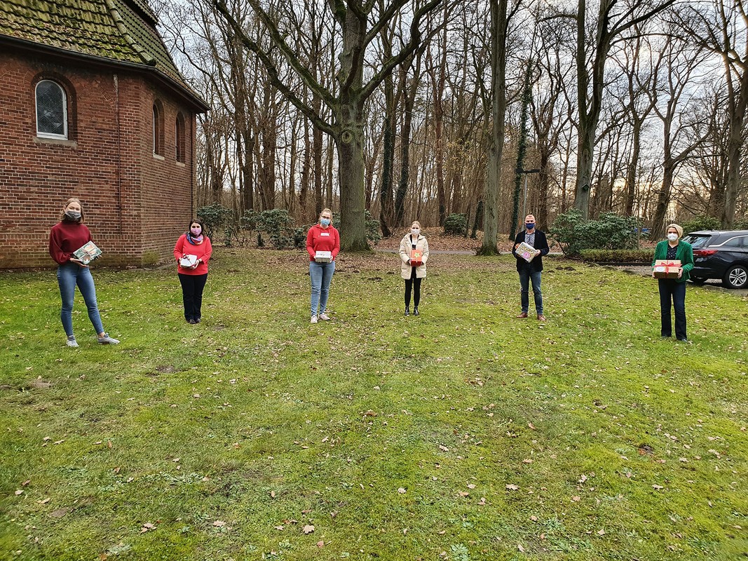 Bildunterschrift Foto 2: Die Auszubildenden (vlnr.) Tanja Kloos, Diana Chindea, Leandra Schürhoff und Jule Peters sowie Ausbildungskoordinatorin Ulrike Höhne (rechts) übergaben die Geschenke an Bernhard Paßlick, Einrichtungsleiter des Vizenzwerk in Handorf.
