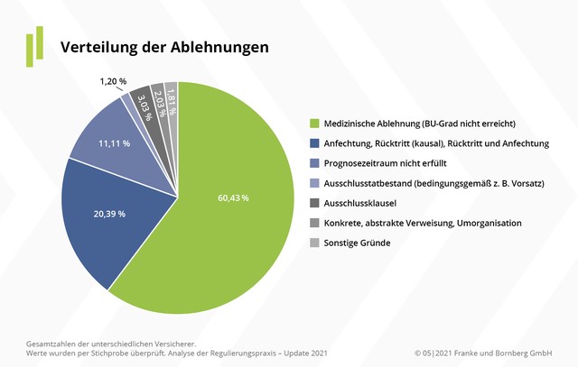 Mehr als der Hälfte aller Ablehnungen (60 %) werden ausgesprochen, weil der vertraglich vereinbarte BU-Grad nicht erreicht wird (Vorjahr 55 %). Bei psychischen Erkrankungen ist ein zu niedriger BUGrad sogar für 68 % der Ablehnungen verantwortlich. Anfechtungen und Rücktritte verlieren an Bedeutung. Auf sie entfallen aktuell 20 % der Ablehnungen gegenüber 25 % im Jahr zuvor. Überproportional hoch ist die Ablehnungsquote bei jungen Erwachsenen. Fast die Hälfte aller Ablehnungen wegen Verletzung der vorvertraglichen Anzeigepflicht werden gegenüber Versicherten bis 35 Jahre ausgesprochen. Einen von neun BU-Anträgen haben die untersuchten Versicherer abgelehnt, weil die diagnostizierte Berufsunfähigkeit voraussichtlich weniger als sechs Monate anhält und somit der Prognosezeitraum nicht erfüllt wird.