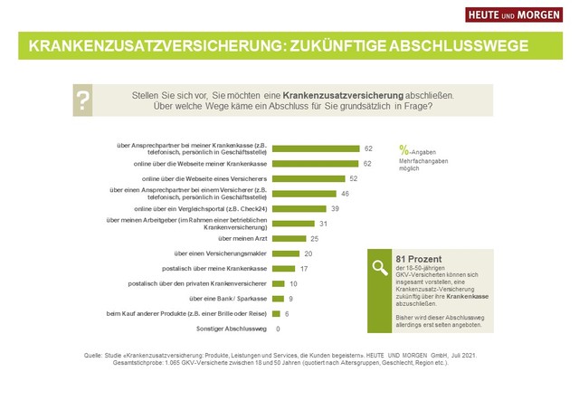 „Gerade bei eher rückläufigem Geschäft im Bereich der Krankenvollversicherungen bieten Krankenzusatzversicherungen privaten Anbietern noch zahlreiche Potenziale in der Gestaltung von Produkten und Services sowie auch in puncto Vertriebswege“, sagt Tanja Höllger, Geschäftsführerin bei HEUTE UND MORGEN. „Krankenkassen können hier ihrerseits für die Mitglieder eine wichtige Service- und Lotsenfunktion einnehmen.“