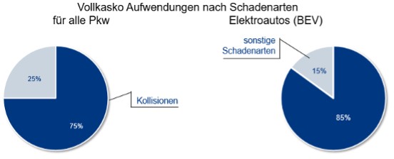 Dabei ähneln Elektrofahrzeuge in Typklasse und Verteilung der Schadenarten den Benzinern, während Plug-in-Hybride dem Diesel-Pkw ähnlich sind. Dies erklärt sich aus der unterschiedlichen Nutzung der beiden Fahrzeugarten. Rein elektrische Antriebe werden bislang primär im urbanen Umfeld benutzt, analog zum Benzin-Antrieb. Die Plug-in-Hybride werden häufig in größeren und langstreckentauglichen Modellen eingesetzt und sind daher im Schadengeschehen den Dieselfahrzeugen ähnlicher.