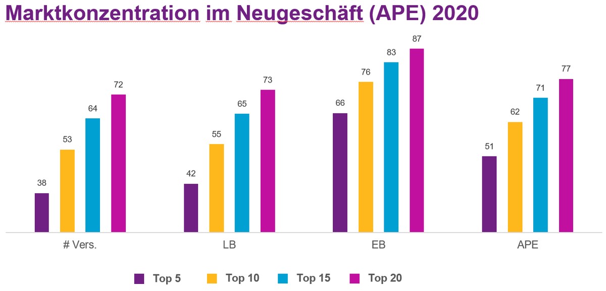 Bei der Marktkonzentration lassen sich kaum Änderungen zum Vorjahr feststellen: Die Top 5 der Lebensversicherer vereinen gleichbleibend einen Anteil von 51 Prozent des APE-Neugeschäfts auf sich, die Top 10 sogar 62 Prozent (Vorjahr: 63) (Abb. 4).