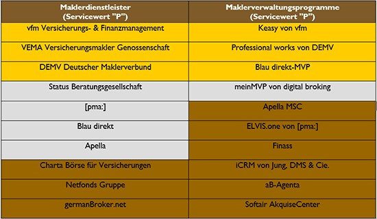 Bei den Maklerdienstleistern bzw. Maklerverwaltungsprogrammen überzeugen noch vor allen anderen vfm Versicherungs- & Finanzmanagement bzw. Keasy von vfm. Neu eingestiegen sind als Maklerdienstleister Status Beratungsgesellschaft und germanBroker.net auf einem Silber- bzw. Bronze-Rang; als Maklerverwaltungsprogramme und beide mit Bronze, Apella MSC und Softair AkquiseCenter. Die jeweiligen Medaillengewinner für beide Kategorien sind im Folgenden aufgeführt: s.o.