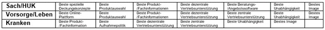Mehr noch als über die sehr gute Gesamtplatzierungen freut sich die Geschäftsleitung der VEMA aber über die hervorragenden Bewertungen der teilnehmenden Makler bei den einzeln Qualitätskriterien, zu denen befragt wurde. In den für die drei Spartenbereiche zusammen 36 Teilqualitätskriterien konnte sich die VEMA in 30 ebenfalls einen Platz auf dem Treppchen sichern. In 20 davon konnte die Maklergenossenschaft als bester Anbieter ausgezeichnet werden – mehr als jeder andere Intermediär: