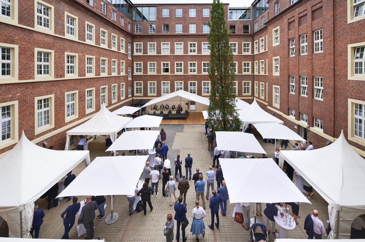 Im Innenhof des historischen Gebäudes lauschen die Gäste bei bestem Wetter der Podiumsdiskussion mit fünf Versicherungsvorständen.