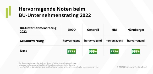 Die Versicherer Ergo, Generali, HDI und Nürnberger stellen sich seit Jahren dem BUUnternehmensrating von Franke und Bornberg. Und können deshalb beim Ratingdurchlauf 2022 mit Top-Ergebnissen überzeugen: Sie erhalten jeweils die Bestnote FFF+ (hervorragend).