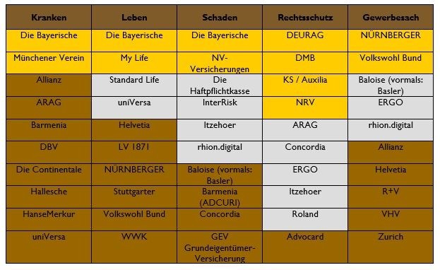 Die Top 10 der Versicherer mit den aus Maklersicht besten Servicewerten je Sparte sind mit Medaillen ausgezeichnet. Auf mehreren Goldrängen liegt Die Bayerische (Kranken, Leben, Schaden), jeweils auf einem liegen der Münchener Verein (Kranken), My Life (Leben), NV-Versicherungen (Schaden), DEURAG, DMB, KS / Auxilia und NRV (Rechtsschutz) sowie NÜRNBERGER und Volkswohl Bund (Gewerbesach). Im Folge sind die jeweiligen Medaillengewinner in allen fünf Sparten aufgeführt.