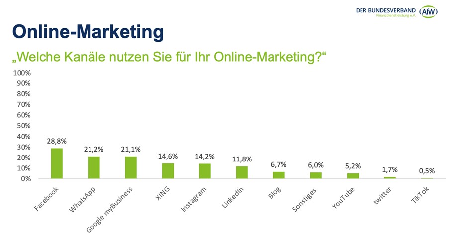 Denn Facebook, das von der jüngeren Generation kaum noch genutzt wird, ist laut AfW-Vermittlerbarometer immer noch der digitale Marketing-Kanal Nummer Eins der Vermittlerschaft. 28,8 Prozent der Befragten nutzen Facebook. Auf den weiteren Rängen folgen WhatsApp (21,2 Prozent), Google MyBusiness (21,1 Prozent), XING (14,6) sowie das bei der jungen Generation besonders beliebte Instagram (14,2). Die beliebteste App der Jugend, TikTok, nimmt mit 0,5 Prozent hier den Schlussrang ein. Mehrfachnennungen waren hier möglich.