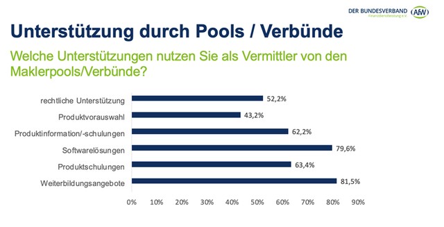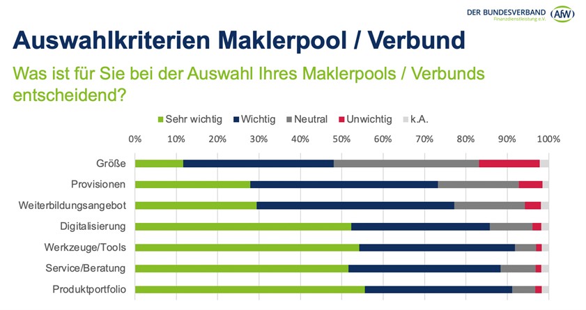 „Nicht die Größe, sondern die Servicequalität, so allumfassend wie möglich, ist das Hauptauswahlkriterium bei der Wahl eines Pools oder Verbundes. Es verwundert nicht, dass angesichts zunehmender Regulierungsvorgaben und immer unübersichtlicherer Angebotspaletten der angebotenen Technik die wichtigste Rolle bei der Auswahl für einen Pool zukommt“, sagt Norman Wirth, Geschäftsführender Vorstand des AfW Bundesverband Finanzdienstleistung e.V. zum Umfrageergebnis.