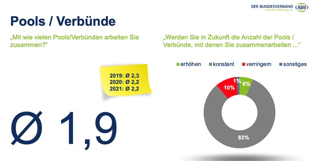 Die Anzahl der jeweiligen Poolanbindungen geht kontinuierlich zurück, mit einem einzigen Pool als Partner zu kooperieren ist jedoch noch immer nicht branchenweit üblich. Nur vier von zehn Vermittelnden (40,5 Prozent) arbeiten mit einem einzigen Pool zusammen. Im Schnitt arbeiten sie mit 1,9 Pools zusammen. Das ist ein Ergebnis des 15. AfW-Vermittlerbarometers, für das 1.305 Vermittlerinnen und Vermittlern Auskunft im Rahmen einer umfassenden Online-Umfrage erteilten. 2019 hatte dieser Wert indes noch bei 2,3 gelegen. 83 Prozent möchten an ihren Poolanbindungen auch nichts weiter verändern, lediglich jeder zehnte Befragte plant, die Anzahl seiner Poolanbindungen zu verringern. 6 Prozent möchten sie gar erhöhen. Insgesamt wickeln die befragten Vermittelnden zwei Drittel (67 Prozent) ihres Umsatzes über Maklerpools ab.