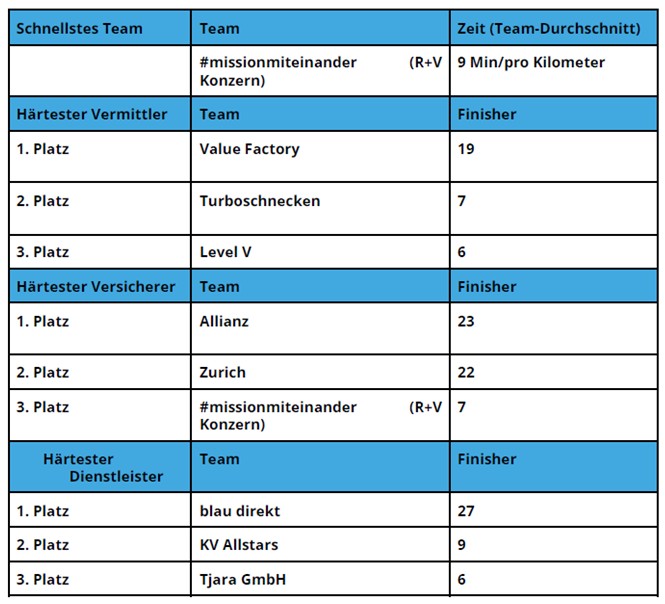 Folgende Teams haben sich gemeinsam durch den Matsch gekämpft: #missionmiteinander (R+V Konzern), Continentale Versicherungsbund, Die Turboschnecken, Janitos-Runner, KV Allstars, Level V Finanz GmbH, The A(llianz)-Team, Tjara - Engel der Zukunft, Helvetia, Value Factory, Zurich Blue Diamonds und natürlich blau direkt. blau direkt absolvierte den Lauf mit 27 Läufer:innen und konnte seinen Titel als “Härtester Dienstleister” verteidigen.