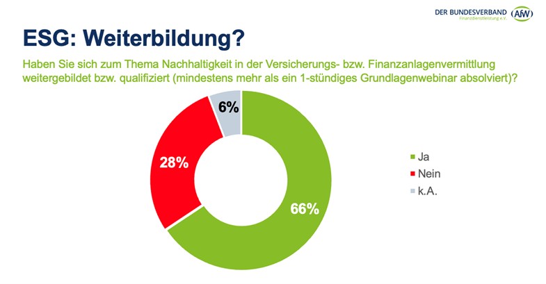 „Wir begrüßen die zunehmende Vielzahl der qualifizierten ESG-Weiterbildungen in der Branche. Der AfW engagiert sich selbst aktiv an der Vermittlung von Fachwissen. Wir haben etwa bei den Leitlinien zur Abfrage der Nachhaltigkeitspräferenzen des Forum Nachhaltige Geldanlagen e. V. (FNG) und des Arbeitskreis Beratungsprozesse e. V. mitgewirkt und gemeinsam mit Votum eine einfach verständliche Hilfestellung zur Offenlegungsverordnung verfasst“, so Wirth. Weitere Informationen dazu finden Vermittlerinnen und Vermittler auf der Webseite des AfW.