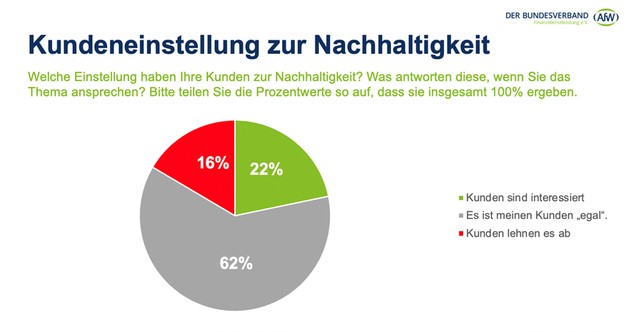 Dies überrascht, weil noch im Vorjahr die Antwort auf diese Frage im AfW-Vermittler-Barometer ganz anders ausfiel: 2022 war eine Mehrheit von 53 Prozent der Kunden bereit, über ihre Nachhaltigkeitspräferenzen sprechen, 22 Prozent lehnten ab und 25 Prozent war das Thema egal. „In einem Jahr ist viel passiert. In der öffentlichen Diskussion ist der Klimawandel hinter aktuelle Themen wie steigende Preise, Wohnungsmangel und geopolitische Risiken wie der Krieg in der Ukraine und die kritische Lage im Nahen Osten zurückgetreten“, nennt AfW-Vorstandsmitglied Norman Wirth eine mögliche Begründung.