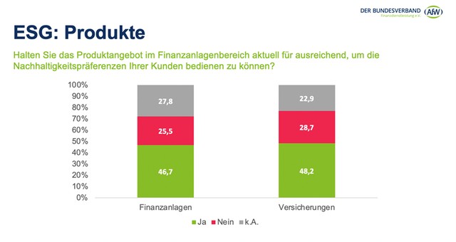 So beurteilt in beiden Produktkategorien jeweils nur knapp die Hälfte der Vermittler – 46,7 Prozent bei Finanzanlagen und 48,2 Prozent bei Versicherungen – das Produktanagebot als ausreichend, um ihre Kunden nach deren Nachhaltigkeitswünschen entsprechend optimal zu beraten. Rund jeder vierte Vermittler hält das bestehende Produktangebot für unzureichend.