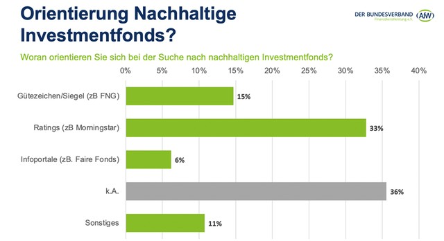 Fragt man konkret nach, woran sich die Vermittler in der Praxis bei der Suche nach nachhaltigen Investmentfonds für ihre Kunden orientieren, kann mehr als jeder dritte Vermittler keine Angabe nennen. 33 Prozent orientieren sich an ESG-Ratings wie zum Beispiel Morningstar, 15 Prozent beziehen sich auf Gütezeichen und -siegel wie zum Beispiel dem FNG-Siegel. Nur 6 Prozent suchen auf Informationsportalen nach den passenden Fonds (siehe Grafik).