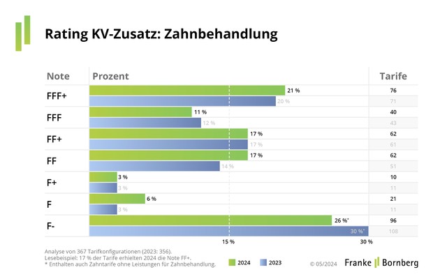 Hier untersucht Franke und Bornberg das Leistungsversprechen der Tarife für Zahnbehandlung, Prophylaxe (professionelle Zahnreinigung) sowie für besondere Behandlungen, die gesetzliche Krankenkassen nur zum Teil oder gar nicht zahlen. Die Topnote FFF+ erhalten 21 % der untersuchten Tarife. Gut ein Viertel der Tarife landen in der Gruppe ungenügend/ keine Leistung, weil sich der Leistungsanspruch auf die Erstattung für Zahnersatz konzentriert. Für Kunden, die beispielsweise keine Leistung für eine professionelle Zahnreinigung benötigen, weil ihre Krankenkasse diese bezuschusst, können diese Angebote dennoch interessant sein.