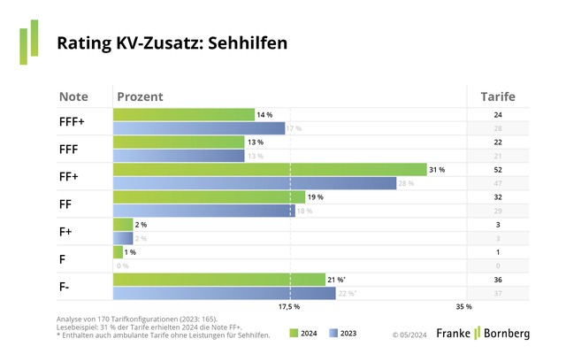 Im Jahr 2023 wurden laut dem Zentralverband der Augenoptiker rund 12,2 Mio. Brillen verkauft. Da sich die GKV für Erwachsene nur noch in Ausnahmenfällen an Sehhilfen beteiligt, sind hohe Eigenbeteiligungen an der Tagesordnung. Was zahlen Versicherer für Gläser, Fassungen oder Kontaktlinsen und in welchem Zeitraum? Anhand dieser Fragen werden die Noten vergeben. 14 % der Tarife im Segment Sehhilfen erhalten ein „hervorragend“.