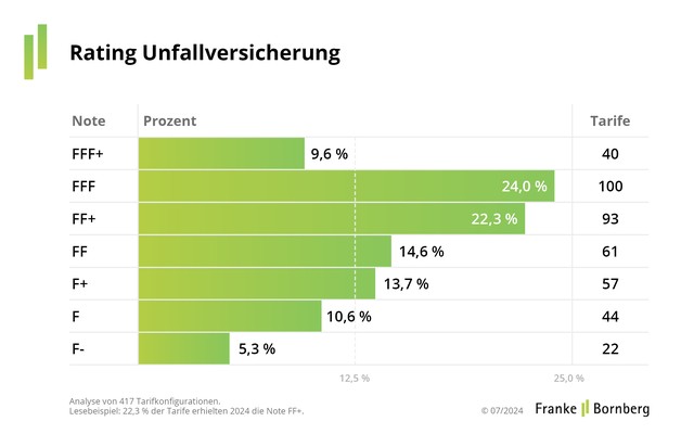 Für das Rating hat Franke und Bornberg insgesamt 417 Tarife von 76 Versicherern analysiert. Für die beste Note FFF+ müssen 85 %, also mindestens 2.316 von 2.725 möglichen Punkten, erreicht sein. Unabhängig von der Gesamtpunktzahl wird ein Produkt stets dann eine Ratingklasse niedriger eingestuft, wenn es die Mindeststandards der jeweils höheren Klasse nicht erfüllt. Für die Note FFF+ müssen neben dem leistungsschädlichen Mitwirkungsanteil von mindestens 75 % u.a. die Kosten für Zahnbehandlung und Zahnersatz übernommen werden, wenn natürliche Zähne bei einem Unfall beschädigt werden.