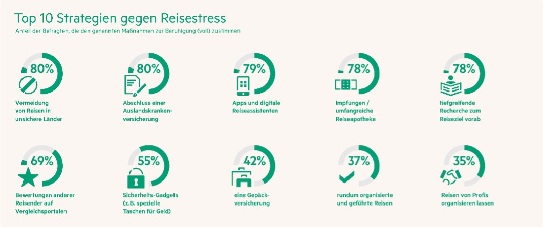 Wenn es darum geht, sich angesichts der vielen potenziellen Stressfaktoren im Urlaub Linderung zu verschaffen, spielt die Auslandskrankenversicherung mit 80 Prozent Zustimmung eine große Rolle. Für Pauschalreisende, die ihren Urlaub im Reisebüro buchen, ist die Absicherung besonders wichtig, mit 90 Prozent Zustimmung in dieser Gruppe landet sie klar auf Platz 1 der beliebtesten Anti-Stress-Strategien. „Jeder Reisende hat abhängig von dem persönlichen Risikobewusstsein, dem Alter, der Urlaubsform und den Lebensumständen individuelle Stressfaktoren, die ihm potenziell Kopfzerbrechen bereiten. Versicherungen können gleich mehrere Sorgen abmildern. Egal ob nah oder fern, selbst gebucht oder vom Reisebüro organisiert: Mit Reiseversicherungspaketen können sich Urlauber unkompliziert rundum absichern, neben dem Krankheitsfall im Ausland auch beispielsweise gegen Gepäckverlust, der laut unserer Studie auch zu den Top-Stressfaktoren zählt“, erklärt Katrin Rieger, Bereichsdirektorin Reisevertrieb Deutschland bei der HanseMerkur. Neben Versicherungen zählen die Vermeidung von Reisen in unsichere Länder oder Regionen (80 Prozent), Unterstützung durch Apps und digitale Reiseassistenten (79 Prozent), Impfungen und eine umfangreiche Reiseapotheke (78 Prozent) sowie die tiefgreifende Vorabrecherche zum Reiseziel mithilfe von Reiseführern, Blogs und Social Media (78 Prozent) zu den Top-Strategien gegen Stress.