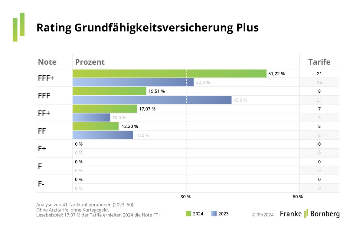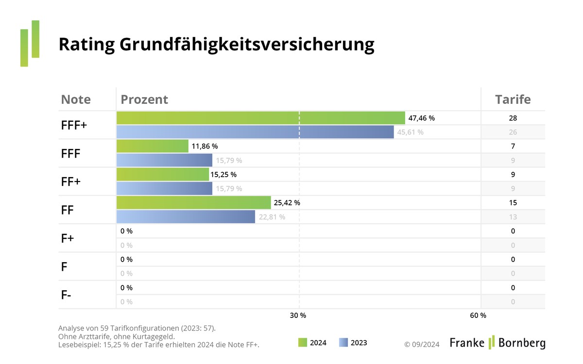 Viele starke Leistungen und einige Stolperfallen – so lautet das Fazit von Franke und Bornberg zum Rating Grundfähigkeitsversicherungen 2024. Untersucht wurden insgesamt 69 Haupttarife mit 5.451 Tarifkombina-tionen. Die Top-Note FFF+ (hervorragend) erhalten 49 Tarifkombinationen.