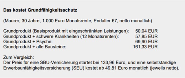 Die Zahl der Anbieter ist gegenüber dem Vorjahr unverändert. Je nach Leistungsumfang und Zahl der Bausteine kann eine GF-Versicherung mehr kosten als ein SBU-Vertrag. Angesichts vieler sehr guter oder sogar hervorragender Grundfähigkeitstarife muss sich niemand mit einem mittelmäßigen Vertrag begnügen. Alle wesentlichen Grundfähigkeiten abzusichern hat Vorrang vor berufsbezogenem Schutz. Gerade weil die Leistungsauslöser von GF-Tarifen ganz anders gestaltet sind als bei BU-Versicherungen, ist eine gute Beratung und Aufklärung von Kunden das A und O der GF-Beratung.