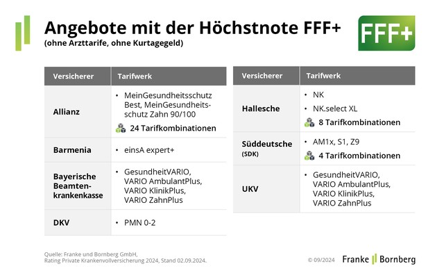 Für die Top-Note FFF+ muss ein Tarif mindestens 85 % von maximal möglichen 19.550 Punkten erhalten. Zusätzlich müssen eine Reihe von Mindeststandards erfüllt sein. Dazu zählen unter anderem freie Arztwahl und Erstattung oberhalb der Höchstsätze der GOÄ, 100 % Erstattung für Ein- oder Zweibettzimmer sowie ein offener Hilfsmittelkatalog.