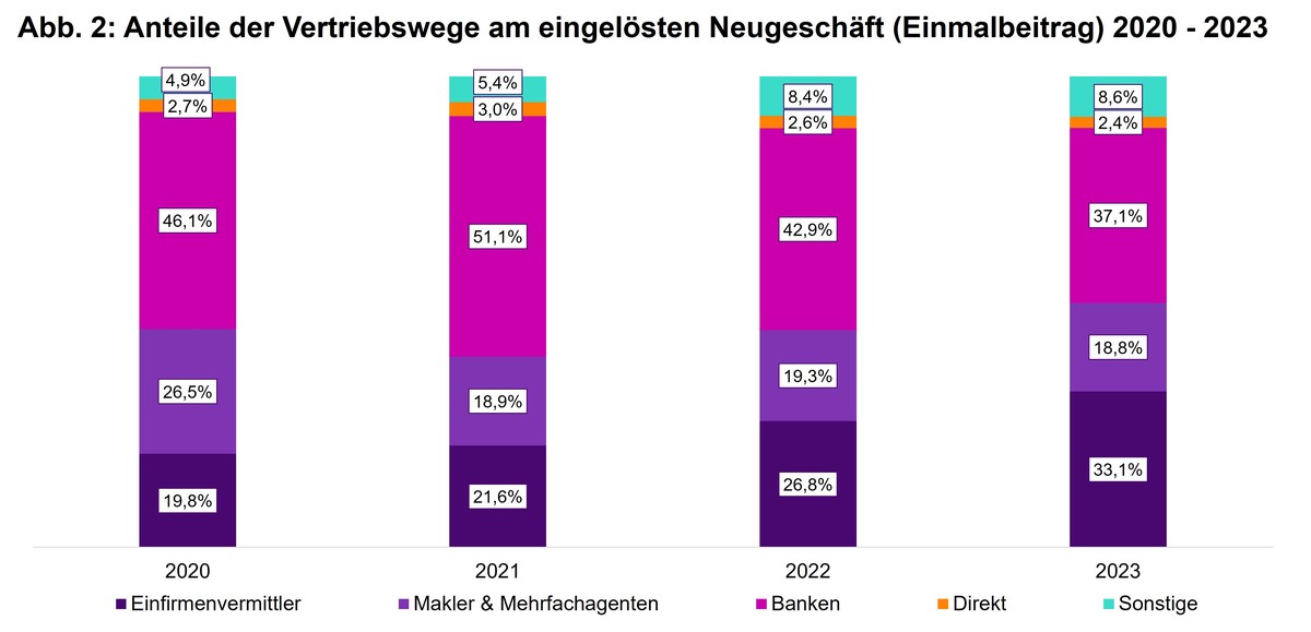 Einfirmenvermittler konnten als einziger Vertriebsweg beim Vertrieb von Einmalbeiträgen leicht zulegen, während Banken mehr als ein Viertel und Makler und Mehrfachagenten nahezu ein Fünftel beim Neuzugang mit Einmalbeitrag verloren haben: Wie im Vorjahr trugen Banken mit einem Minus von 2,4 Milliarden Euro den Großteil des Rückgangs. Während auch Makler und Mehrfachagenten ein Minus von 700 Millionen Euro verzeichneten, konnten die Einfirmenvermittler bei den Einmalbeiträgen sogar um 230 Millionen Euro zulegen. Aus diesem Grund sank der Vertriebsanteil der Banken bei Einmalbeiträgen besonders stark von 43 Prozent im Vorjahr auf 37 Prozent in 2023 (Abb. 2), mit der entsprechenden Auswirkung auf den Vertriebsanteil gemäß APE (Abb. 1).