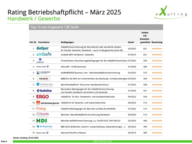 In der Branche ‚Handwerk‘ konnten sich beispielsweise Zurich, BGV und der Münchener Verein neu unter den Bestplatzierten positionieren. Besonders stark zurückgefallen sind hingegen Rhion.digital, VHV und Württembergische – vor allem aufgrund der Verdrängung durch neuere Deckungen.
