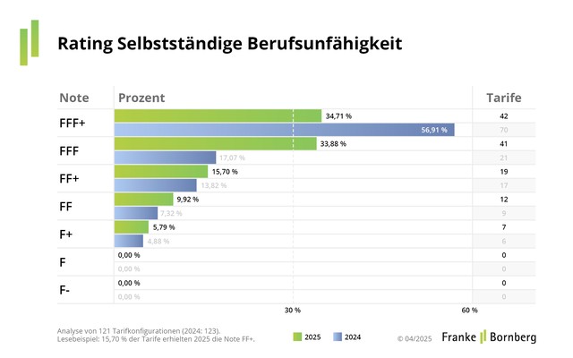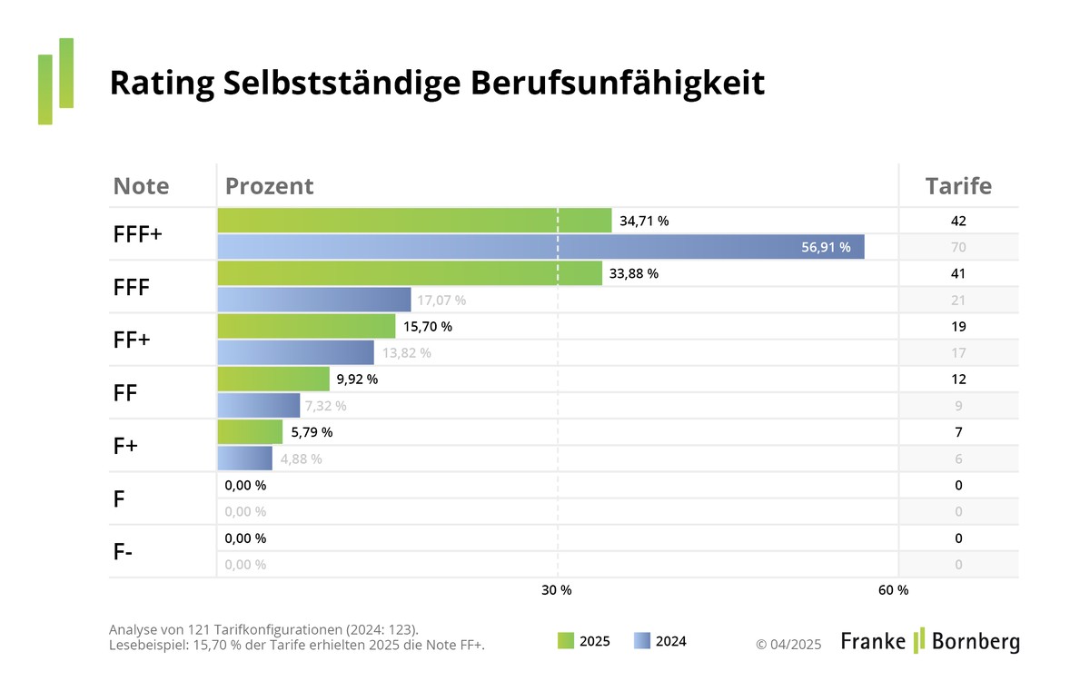 Für das Rating zu selbstständigen BU-Tarifen (SBU) hat Franke und Bornberg 121 Tarife von 54 Versicherern nach 74 Kriterien analysiert. Die notwendige Neujustierung von Ratingkriterien zeigt, welche Tarife und Anbieter in Qualität, Stabilität und Leistungspraxis überzeugen können: 2025 erhält nur noch jeder dritte Tarif (34,71 %) die Bestnote FFF+ hervorragend. Im Vorjahr waren es noch 57 % gewesen. 17 von 54 Versicherern platzieren mindestens einen Tarif in der Top-Gruppe.