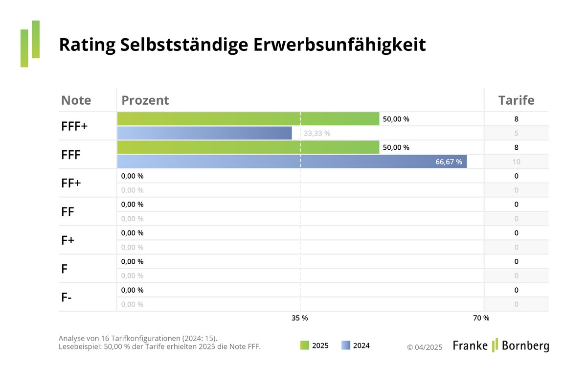 Seit Jahren schrumpft das Angebot bei der selbstständigen Erwerbsunfähigkeitsversicherung (SEU). Oft wird unterstellt, sie biete Versicherungsschutz 2. Klasse. Dabei ist die SEU gerade für körperlich Tätige eine bezahlbare Alternative zur Berufsunfähigkeitsversicherung. Eine ihrer Stärken: Sie leistet auch bei Erwerbsunfähigkeit durch psychische Erkrankung. Für das SEU-Rating 2025 konnte Franke und Bornberg nur 18 Tarife von zwölf Anbietern analysieren. Acht von 16 Tarifen (50 %) sind hervorragend (FFF+), weitere acht erhalten die zweitbeste Note FFF sehr gut. Kein einziger Tarif schneidet schlechter ab. 6 der zwölf Gesellschaften platzieren mindestens einen Tarif in der TopGruppe.