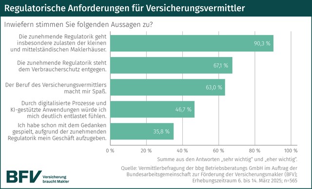 „Regulierung ist wichtig – keine Frage. Den Mehrwert und Verbrauchernutzen betonen auch Versicherungsmakler ganz klar bei der Weiterbildung und Kundenaufklärung“, so Erwin Hausen, Koordinator der BFV. „Aber eine Überregulierung führt dazu, dass für qualifizierte Beratungen weniger Zeit bleibt. Doch die ist der eigentliche Kern des Verbraucherschutzes.“ Die Mitgliedsunternehmen der BFV – darunter zahlreiche etablierte Maklerversicherer – setzen sich daher aktiv für praxisnahe Lösungen bei europäischem und deutschem Gesetzgeber und Aufsicht ein. Zudem arbeiten sie gemeinsam daran, Vermittler durch digitale Tools, schlanke Prozesse und zielgerichtete Schulungen zu entlasten. „Die Überregulierung frisst Zeit, die für die persönliche Kundenberatung und -betreuung gebraucht wird. Das betonen wir in unseren Stellungnahmen auf politischer Bühne immer wieder. Mit unserer Vermittlerbefragung konnten wir das nun auch quantifizieren“, so der BFV-Koordinator.