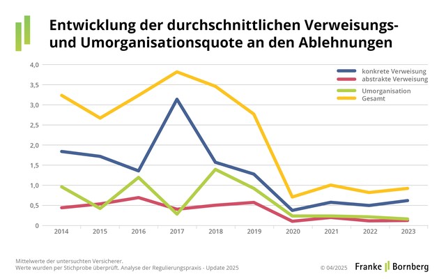 Anders, als viele Veröffentlichungen vermuten lassen, spielt die Verweisung auf eine andere Tätigkeit in der Praxis kaum eine Rolle. „Als Ablehnungsgrund sind Verweisungen nur in homöopathischen Dosen nachweisbar“, kommentiert Michael Franke. Mit einer Quote von 0,12 % beziehungsweise sieben Leistungsfällen aus dem Altbestand eigne sich der Verzicht auf abstrakte Verweisung als Differenzierungsmerkmal längst nicht mehr. Das gelte auch für die Forderung nach Umorganisation des Unternehmens, die in weniger als 0,16 % zu einer Ablehnung geführt habe. In Summe sind Verweisung und Umorganisation bei den teilnehmenden Gesellschaften für weniger als 1 % aller Ablehnungen verantwortlich.