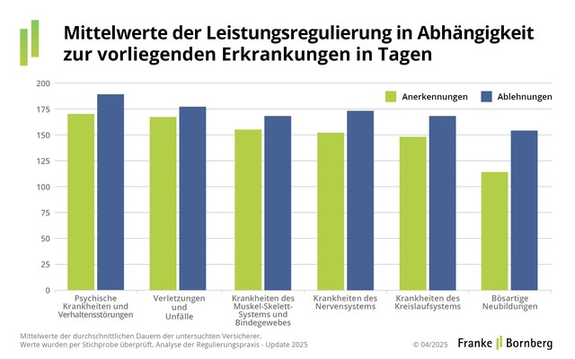 Die Faustformel hat sich bewährt: Vom Eingang des Antrags auf BU-Leistungen bis zur Entscheidung vergehen ungefähr sechs Monate. In der aktuellen Erhebung mit Daten aus dem Jahr 2023 dauerte es mit insgesamt 190 Tagen etwas länger. Für Ablehnungen nehmen sich Versicherer mehr Zeit (197 Tage) als für eine positive Entscheidung (179 Tage). Bei psychischen Erkrankungen und bei Unfällen ist ihr Zeitbedarf besonders hoch, weil Regulierer oft auf ärztliche Gutachten oder Berichte von Polizei und Staatsanwaltschaft warten müssen. Vergleichsweise schnell fällt die Entscheidung bei Krebs.