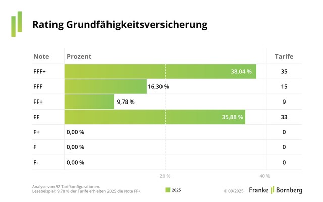 Aktuell agieren 26 Gesellschaften mit 7.600 Tarifkombinationen am GFV-Markt. Das Rating bewertet 70 Kriterien. Nur knapp 40 % der Tarife erreicht die Bestnote FFF+ hervorragend. Ein weiteres Drittel der Tarife scheitert an einer besseren Note vor allem, weil sie die neue Grundfähigkeit „Ziehen oder Schieben“ oder eine andere der 16 Kern-Grundfähigkeiten nicht absichern.