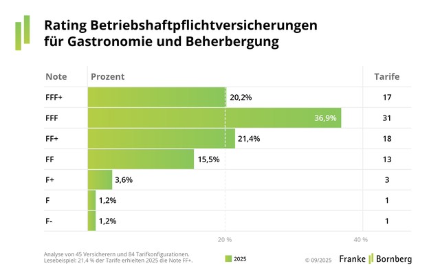 Untersucht werden 84 Tarifen von 45 Gesellschaften. Bei der Qualität bleibt noch immer viel Luft nach oben. Nur 20,2 % der Tarife für Gastronomie und Gastgewerbe erhalten die Note FFF+ (hervorragend). Jeder fünfte Tarif erreicht maximal die Note „befriedigend“.