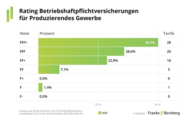 Besonderes Gewicht erhält hier die (Erweiterte) Produkthaftpflicht. Bewertet werden 70 Tarife von 39 Versicherern. Hier ist der Auftakt fulminant: BHV-Tarife für Produktionsbetriebe erhalten aus dem Start Spitzenbewertungen. 40,0 % platzieren sich in der Spitzengruppe FFF+.