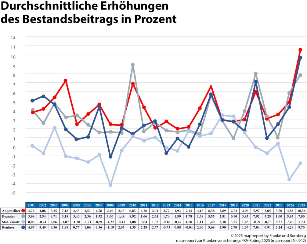 Bei Beamten kletterten die Beiträge durchschnittlich um 7,8 % (Vorjahr: 5,9 %), mit einer Bandbreite von 2,0 bis 31,2 %.